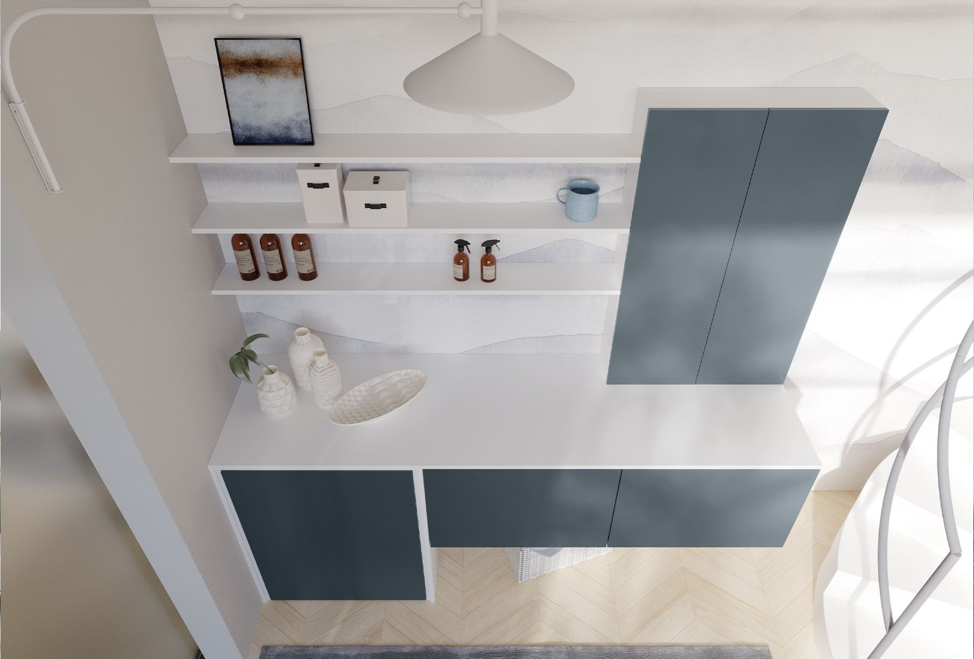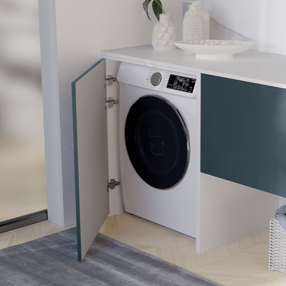 Versatility is its strong point. Thanks to a range of modular components, it allows you to create a custom laundry room, organizing detergents, linens, and accessories with spacious drawers and adjustable shelves.