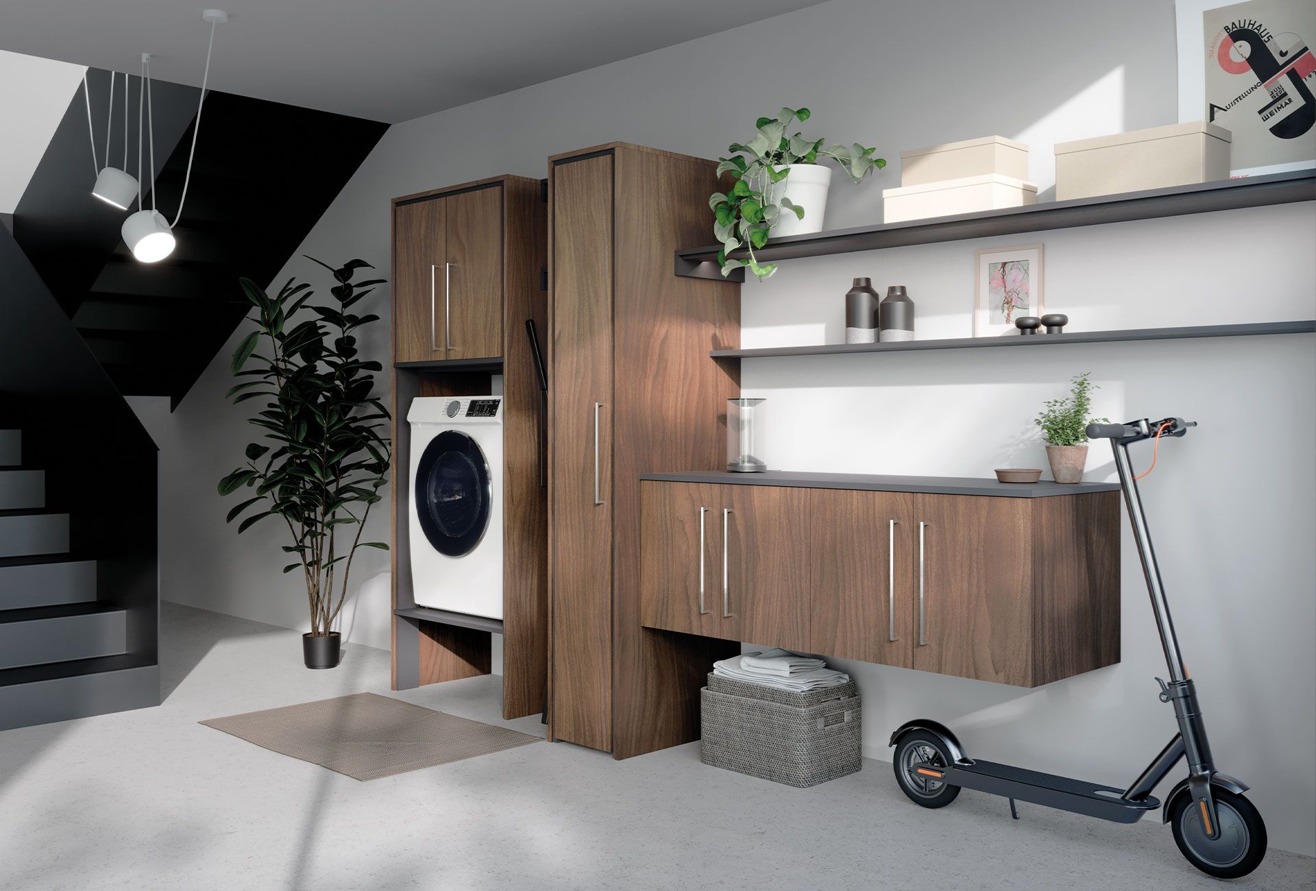Versatility is its strong point. Thanks to a range of modular components, it allows you to create a custom laundry room, organizing detergents, linens, and accessories with spacious drawers and adjustable shelves.