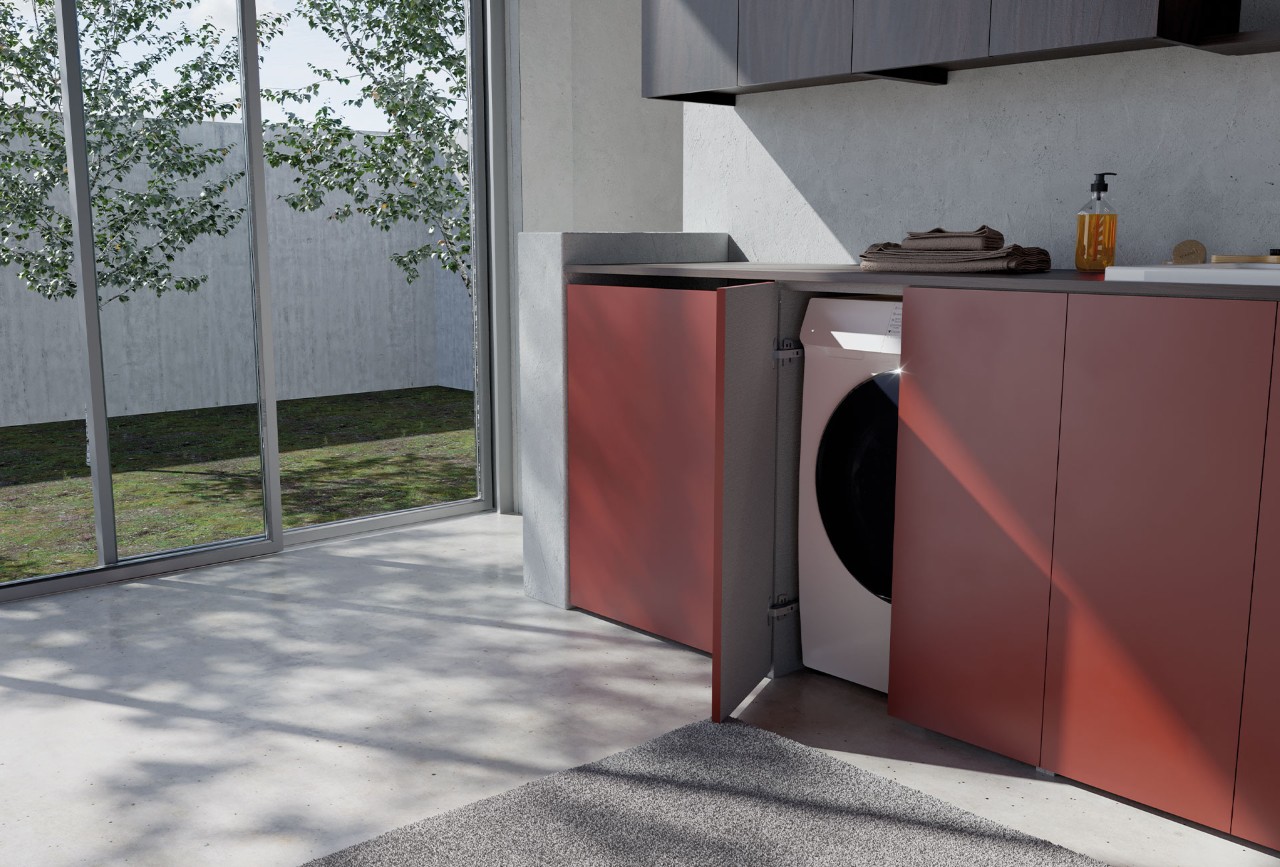 Perimetro is a project that offers ideal solutions for organizing domestic spaces: a space for a washer and dryer, convenient storage areas, and a cabinet with a built-in sink. Designed by Marco Pellici, this functional and practical storage module is easy to integrate with bathroom cabinetry.
